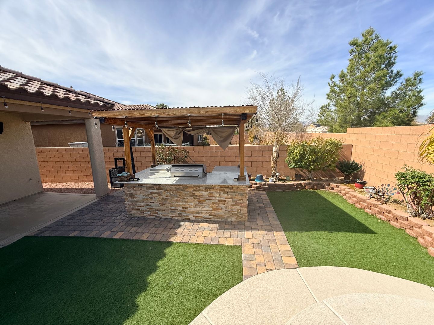 This amazing 1 Story home has 4 Bedrooms and a Fantastic back yard with covered Patio Built in BBQ and Pool/Spa combo